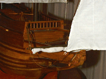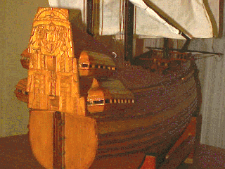 The bow section, pictured here, was very ornate on the original ship, including over a dozen carved figurines that were gilded with gold leaf. Provisions have been made on the model to accept such ornamentation when and if it is done. The model does include a carved lionhead which denotes this as a royal warship. |