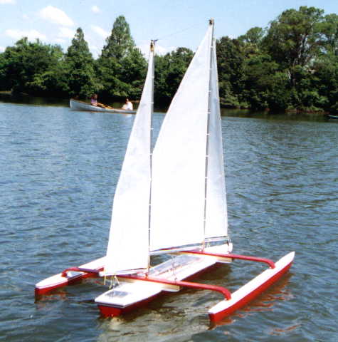 The model was built out of fiberglass from two home-made fiberglass molds, measuring 65 inches LOD. The pontoons are held in place by a pair of amrons that were built by bending and laminating 6 strips of 1/16" plywood. They are a little heavier than desired, but are very strong. A dagger-board was mounted below the main hull, modeling the center-board used on the real ship for lateral resistance. No keel weight is used on the model at all; relying solely on the pontoons for stability.