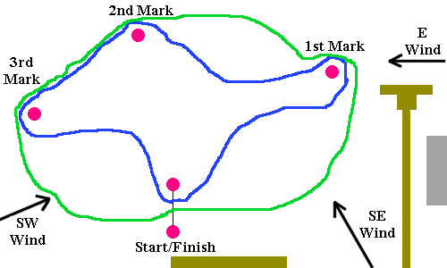 Finally, when coming around the last mark to the finish, captains were met with an excruciating choice. If the SouthWest wind stayed strong enough, then it would easily push a ship along to the finish line on the outside (green) track. However, if it didn't stay strong enough, then the East wind would propel ships along the inside track to the victory. Consequently, on quite a few occasions, the leader of the first or second laps of a race were befuddled as they rounded the 3rd mark free and clear of everyone else, but then got caught on the wrong track, while the captains of the ships behind watched the situation unfold and got the benefit of the lead ships selection.