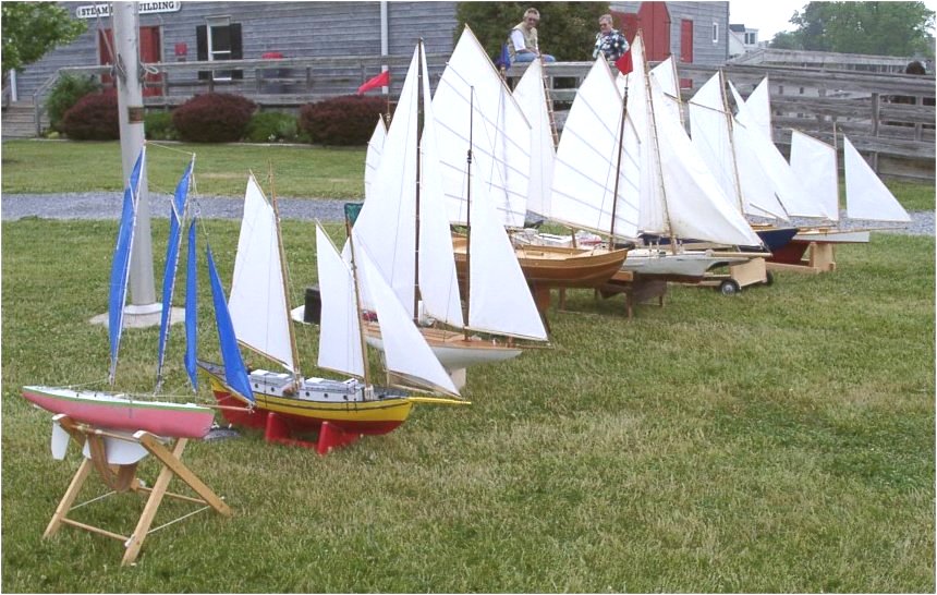 | Six official races were held, with one practice lap beforehand. Ed Gera came out of the gate fast, winning the practice lap with his new Pinky Schooner. In the first official race, Frank's Chesapeake 50 and Bob's Gloucester Fishing Schooner were trading places in the lead around most of the 2 lap course until Bob decided to T-bone Frank going around the last mark, taking both of them out of the race. George's Sharpie (which nearly flipped over during the warm up session because of a strong puff and little ballast) took advantage of the race leaders problems and crossed the line for the win. In the second race, Frank was battling with George for the lead on the first down-wind leg when George's Sharpie was overpowered by a gust of wind and, yes again, T-boned Frank's Schooner taking them both out of the race. In fact, two other pairs of boats, 6 in total, were tangled along the course because of very strong puffs while running downwind. Herb's Bugeye steered clear of all trouble and took the gun. In the third race, Marty's Lady Jane weathered the course better than anyone else and won the first race without a major tangle of boats. |