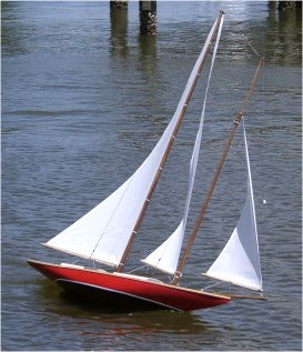 The first race began with George's Sharpie in the lead, followed by Bob's boat, Marty's Topsail Schooner and Frank's Junk. The Sharpie made it to the first mark in record time, only to discover that it was too over-powered to turn and go downwind, which sent it on a course far longer than necessary. Bob's boat took a similar course, without the helm needed to proceed around the course. Both Marty and Frank took the opportunity to move into better positions, since both of their boats are much larger and were handling the now gale force winds (in scale) better. At the downwind mark, Marty lead the race and was assumed to be a sure winner. However, during the last upwind leg, the Lady Jane was giving up too much leeway and missed the finish buoy by a foot. She still had plenty of time over the Chinese Junk to pull out a victory, but a mechanical problem prevented the Topsail Schooner from completing its turn.