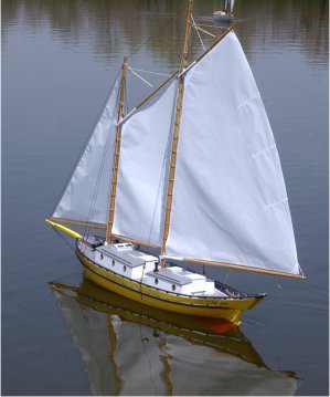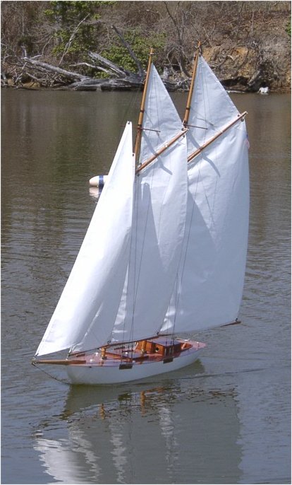 | Herb Jones began the process by tracking down and acquiring the plans from the Herreshoff collection at MIT. Based on the plans, he scaled the 70+ foot boat down to the 48 inches allowed by the AMYA schooner rules, allowing the Chesapeake 50 to be raced in their sanctioned events. Herb constructed a wooden plug of the ship, using a plank on frame technique, including a fully planked deck. The bottom 5 inches or so of the keel was left off of the plug in order to make hull production easier. After sanding and preparing the surface, Herb turned the plug over to Frank Pittelli for molding and continued to develop a plug for the keel. | ![]() |
